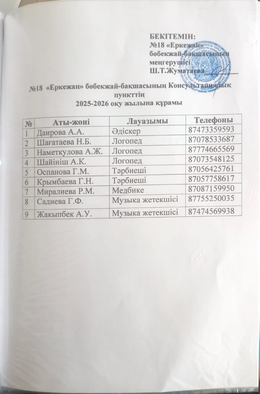 Консультациялық пункт мамандарының құрамы » №18 "Еркежан" бөбекжай-бақшасы"